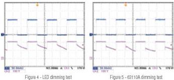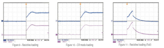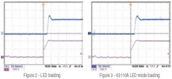 LED driver的輸出漣波電流可以透過調(diào)整63110A內(nèi)部電阻 (Rr) 來模擬。傳統(tǒng)電子負載無法模擬LED driver的輸出漣波電流,如圖6所示。圖7為LED當負載時的漣波電流。圖8為63110A當負載時的漣波電流。 圖9是以真實電阻為負載的拉載電流波形(藍色);圖10為定電阻模式模擬真實電阻的拉載電流波形(藍色);圖9與圖10的電流與LED為負載的電流波形有相當大差異,且電流及電壓都有過沖的情況發(fā)生,易導(dǎo)致LED driver在開機時發(fā)生過電壓或過電流保護,如圖11所示。因此不管是真實電阻或是電子負載的定電阻模式,都比較無法模擬真實的情況。 |
